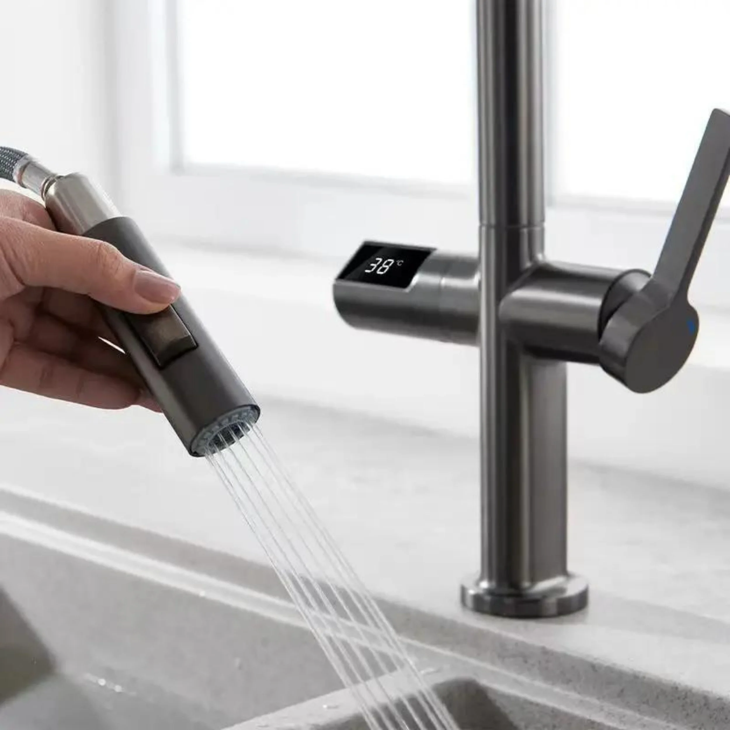 The Mukansa Immon Series is a faucet model that offers an innovative solution for modern kitchens, combining elegance and functionality. Thanks to its digital display screen , this model allows you to instantly see the water temperature , providing complete control over your kitchen tasks. Both ergonomic and practical, this faucet attracts attention with its innovative design. The Immon Series, with its spiral hose structure , provides both waterfall flow and normal flow modes. The waterfall flow allows water to cascade naturally, while the normal flow mode offers an ideal water flow for everyday use. This feature allows users to have versatile usage options for different situations. With its innovative design, elegant appearance, and digital technologies, Immon will take your kitchens to the next level. Its stylish and modern lines complement any kitchen decor. Its user-friendly structure makes your kitchen tasks more efficient and enjoyable.